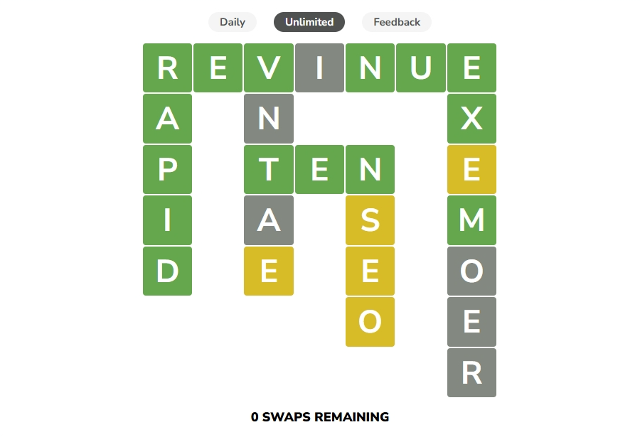 - With limited swaps, avoid random moves. Plan each swap to affect multiple words (horizontal and vertical) and aim to solve shorter words first to unlock clues for longer ones.